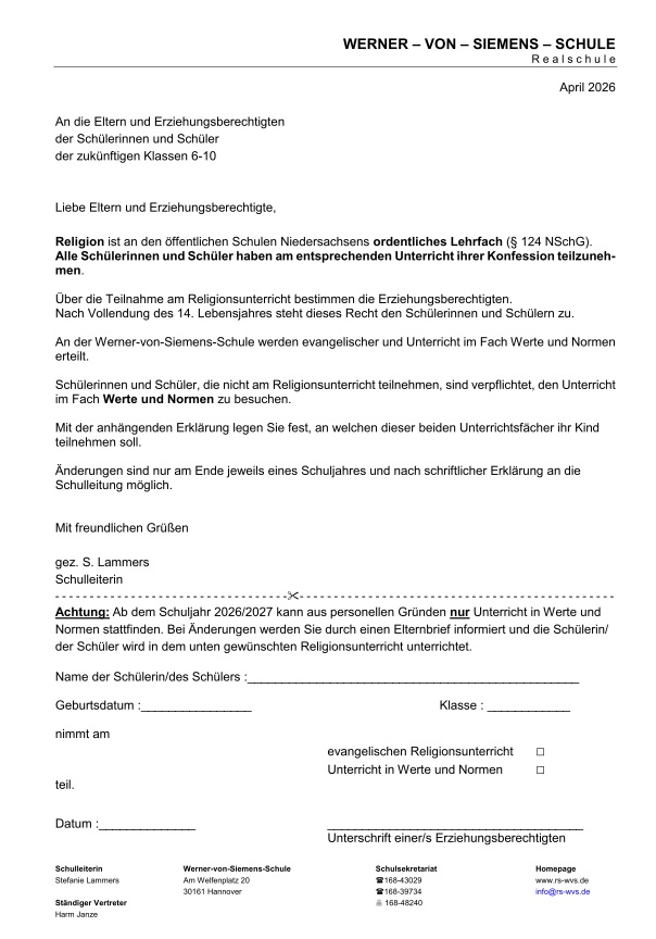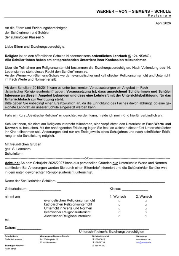 Bis zum 30.06. eines jeden Jahrs muss die Erklärung über den Wechsel des Religionsunterricht erfolgen.